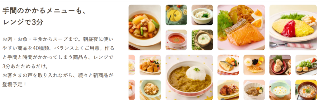 | メリット | 塩分量・カロリーの面が優れ、温めるだけで夕飯が食べられる |