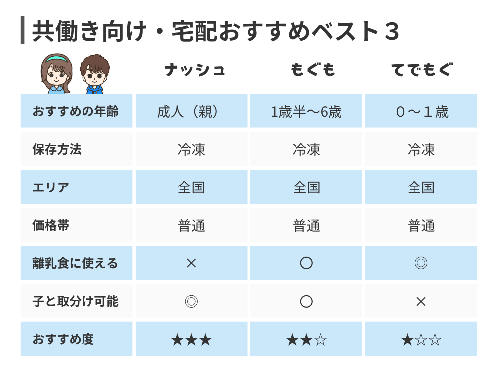 といった具合に、帰宅~就寝までの家族のスケジュールに合わせ、宅配サービスを選ぶとよいでしょう。