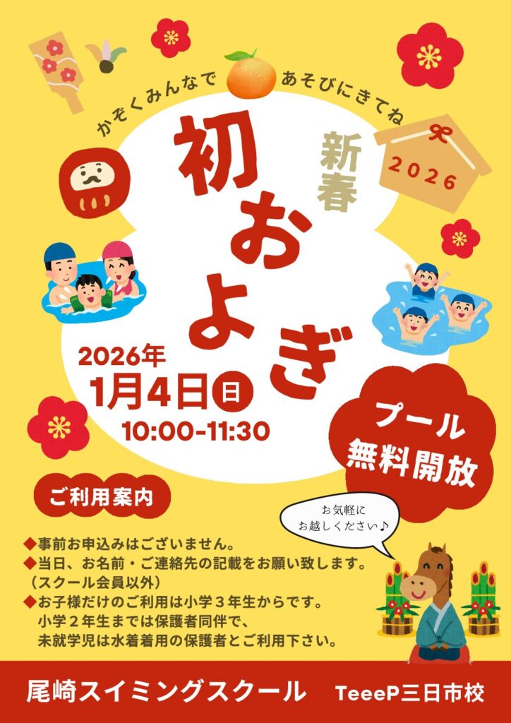 いつも尾崎スイミングスクールTeeep三日市校をご利用いただきありがとうございます。新春初泳ぎについてご案内いたします♪ご家族、お友達をお誘い合わせの上、ご来館ください!皆様のご来館、心よりお待ちしております。