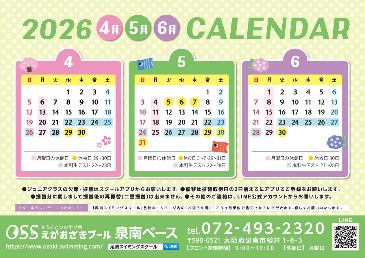 いつも尾崎スイミングスクール尾崎校をご利用いただき、誠にありがとうございます。 2026年4月から6月のスクールカレンダーをお知らせいたします。