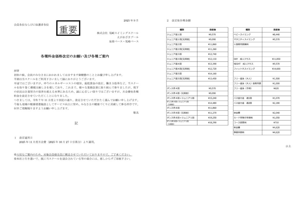 2025年11月より価格改定を行うことになりました。改定後の料金について、添付画像をご確認ください。