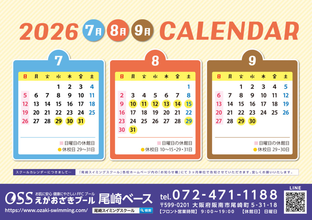 2026年7月~9月のスクールカレンダーをお知らせいたします。